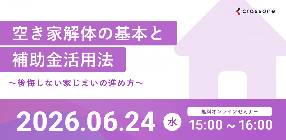 16万件以上の家じまいや解体工事に関する相談に携わったクラッソーネから、『空き家問題の現状』『解体工事の進め方』『実例から見る解体工事に必要なお金の話』『解体工事会社の選び方』『補助金活用法』についてプロの視点で解説します。