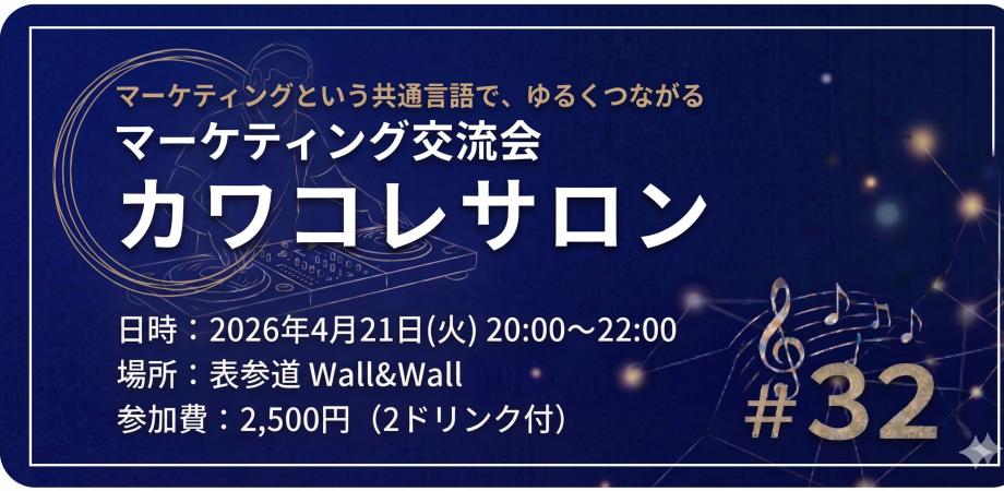 マーケティングに関わる人たちが、お酒と音楽を愉しみながら気軽に情報交換できる場を——そんな思いからはじまった「カワコレサロン」が、4月21日(火)に第32回目を迎えます。今回の会場も表参道駅すぐの「Wall&Wall」。国内最高品質のスピーカーから流れる音楽と、美味しいお酒を片手に、気負いすぎない"ちょうどいい温度感"で楽しんでください。