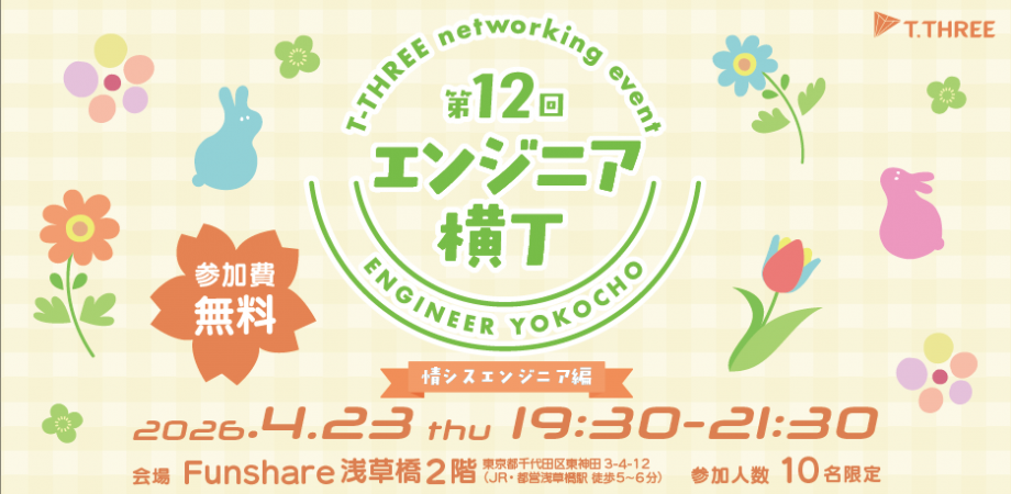 ティースリー株式会社 HP:https://t-tthree.com/Wantedly:https://www.wantedly.com/companies/t-tthree2代表榎本SNS:https://x.com/t3group_enomoto主催市川SNS:https://x.com/ayamaru_0105_エンジニア横丁:https://t-tthree.com/engineer-yokocho/