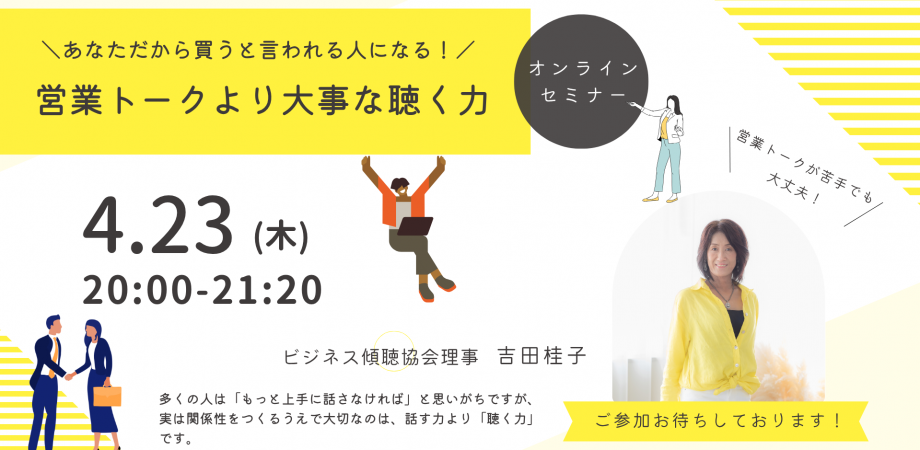 営業トークが得意じゃなくても大丈夫!聴く力を鍛えて、相手に信頼される方法を知りたい方はぜひご参加ください!