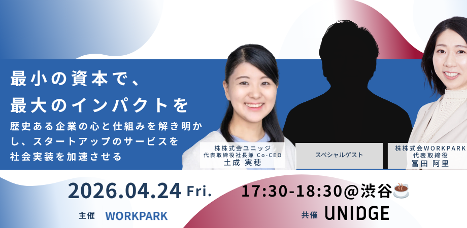 本セッションでは、大企業の内部で変革を率いてきたJR西日本 安井氏、共創のプロフェッショナルであるユニッジ 土成氏を迎え、彼らの「行動原理」の深淵に迫ります。・企業の成り立ちから紐解く「意思決定」の流れ・担当者の背負っている「歴史」と「責任」をどう理解するか・伝統ある組織が、新しい志に「共鳴」し、動き出す瞬間の作り方スタートアップと大企業、どちらかが、「使い倒す」のではなく、「共に歴史の先をつくる」ために。 持たざるスタートアップが、先人の築いた巨大な基盤をレバレッジに変え、社会の景色を書き換えるための実践論を語ります。
