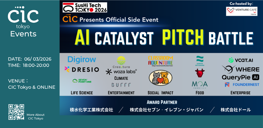 AIと既存産業の融合最前線を体感するピッチイベント「AI CATALYST PITCH BATTLE 」を、SusHi Tech Tokyo 2026公式パートナーとして4月27日にCIC Tokyoで開催します。AIを軸としたライフサイエンス、フード、環境、エンターテインメントなど多様な領域のスタートアップが登壇します。また、事業会社が審査員 & アワードパートナーとして参画!各社には、登壇スタートアップのピッチをご覧いただき、それぞれの視点から特に注目した企業を選出し、アワードを授与いただく予定です。※イベントでは日英翻訳サービスをご利用いただけます。■アワードパートナー積水化学工業株式会社、株式会社セブン‐イレブン・ジャパン、株式会社ドール Dole Japan, Inc. 、Anywhere Ventures(米国)※社名掲載順は順不同です。■ 開催概要日時:2026年4月27日(月)18:00~20:30会場:CIC Tokyo(東京都港区虎ノ門1-17-1 虎ノ門ヒルズビジネスタワー15F)開催形式:ハイブリッド(現地参加+オンライン配信予定)参加費:無料■ 当日のプログラム(予定) 18:00-18:10 アワードパートナーによるリバースピッチ(約2分) 18:10-19:40 スタートアップピッチ(1社あたり3分間のピッチ+最大2分間のQ&A) 19:40-19:50 審査 19:50-20:00 アワードの発表 20:00-20:30 セッション後のネットワーキング※プログラム内容は変更となる場合があります。