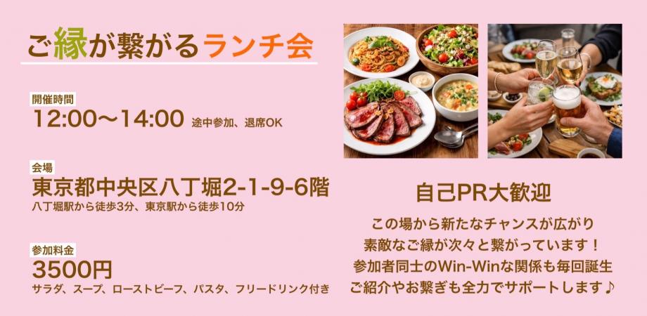 イベント詳細 【ご縁が繋がるランチ会について】ご飯を食べながら、交流をして仲間を作ったり、人脈を広げたりなどを目的としたイベントで、比較的女性が多くいつも10名から20名が参加されています。 【こんな人におすすめのイベントです】・気軽に参加できる交流会に興味がある・仕事の合間や休日に楽しい時間を過ごしたい・友人、人脈を増やしたい・美味しいご飯が食べたいこんな思いにこたえる交流会です!もちろん「目的は特になし、ただ参加してみたい」人も大歓迎です!【参加料金】3500円(税込)※食事、フリードリンク付き※参加当日の現金払い【会場】東京都中央区八丁堀2-1-9川名第一ビル6階 Hanami八丁堀駅,、宝町駅から徒歩4分東京駅から徒歩10分【時間】12:00から14:00途中参加、途中退室OK!①受付開始 11:45②イベントスタート 12:00③イベント終了 14:00【禁止事項とご利用規約】当会では参加者の皆様に楽しく安全にお過ごしいただくため下記の禁止事項を設けてます。参加者の皆様は、参加者間、参加者と当会スタッフ間において、パワハラやセクハラ、暴言、大声、差別的な発言、悪口、嫌がらせ、いじめ、過度な勧誘や営業、執拗に連絡先を聞く事、進行の妨害、チラシ配布をすることはできません。参加者から複数のクレームが起きた場合は理由の如何を問わず以後のご参加をお断りします。また理由等の説明をいたしません。【中止について】地震、台風などの災害や悪天候時には皆様の安全を確保するために当社の判断により当会は中止されます。中止の場合はメールにてご連絡させていただきますので、極端に天候が悪い時は確認してください。【免責事項】当運営では当会の予約、参加、中止等で起きる事故、トラブル、損害について保証することはありません。また参加者間で起きた係争等に仲裁に入ることはありません。【よくある質問】Q. 持ち物はありますか?A. 参加料金だけお持ちしていただければ手ぶらでも参加可能ですが、持ち込みも可能です。Q. 連絡先交換はできますか?A. 個人的に連絡を取り合っていただいて問題ございません。※運営スタッフの一部を除きますQ. キャンセルできますか?A. キャンセル可能です。Q. ドタキャンにペナルティーはありますか?A. 無断キャンセルが多い方は以後のイベントへご参加をお断りする場合があります。...