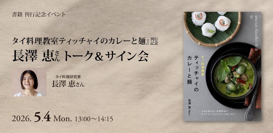 イベント詳細 タイ料理好きからの熱い支持を受け続ける、錦糸町のティッチャイタイフード。これまでに40,000人以上の参加者が集い、その多くがリピーターとして通うなどたくさんの人に親しまれてきたタイ料理教室です。主催はMay先生こと長澤恵先生。タイの屋台料理から郷土料理、専門料理から宮廷料理まで幅広く学べる本格的なレッスンを行っています。また、レトルトタイフードでお馴染み「ヤマモリ タイカレー」の監修を手掛けるなど、タイ料理の魅力を追求し続けるプロフェショナルでもあります。この度はそんな長澤先生が得意とする料理の中から“カレー”と“麺”にフォーカスしたレシピ集『タイ料理教室ティッチャイのカレーと麺』の発売を記念し、著者の長澤恵先生をお迎えして開催するトークイベントを開催します。イベントでは、トークショーのほかタイカレーペーストの試食などもお楽しみいただけます。一度食べたらやみつきになる永久保存版のティッチャイの味をぜひ楽しんでいただけたらさいわいです。