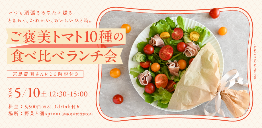 ①日時:5/10(日) 12:30〜14:30②場所:野菜と酒sprout③内容:解説付き!トマト10種食べ比べ&アレンジランチ料理(ワンドリンク付き)④料金:おひとりさま¥5,500(税込)※現金支払い