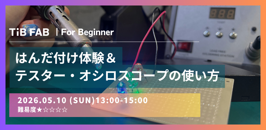 【イベント概要】名 称:【初級編】はんだ付け体験&テスター・オシロスコープの使い方内 容:半田付け・テスター・オシロスコープの体験日 時:2026年5月10日(日)13:00〜15:00(12:50 集合)会 場:Tokyo Innovation Base 2F TIB FAB参 加 費:500円(税込)※材料費込みです対象年齢:15歳以上定 員:5名主 催:TIB FAB運営事務局