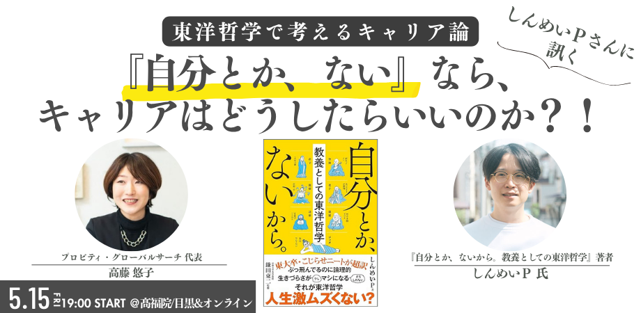 ベストセラー『自分とか、ないから。教養としての東洋哲学』(20万部突破)の著者・しんめいPさんをお招きし、東洋哲学×キャリアをテーマにした特別対談イベントを開催します。1万人以上のキャリアに接してきたソーシャルグッド転職を支援する高藤悠子との対話で、「働く意味」「自分らしいキャリア」「人生のあり方」を、東洋哲学の視点から問い直します。「自分とか、ないから。」の世界の先に広がるキャリアについて、参加者の皆さんとも意見を交わしたいと思います。