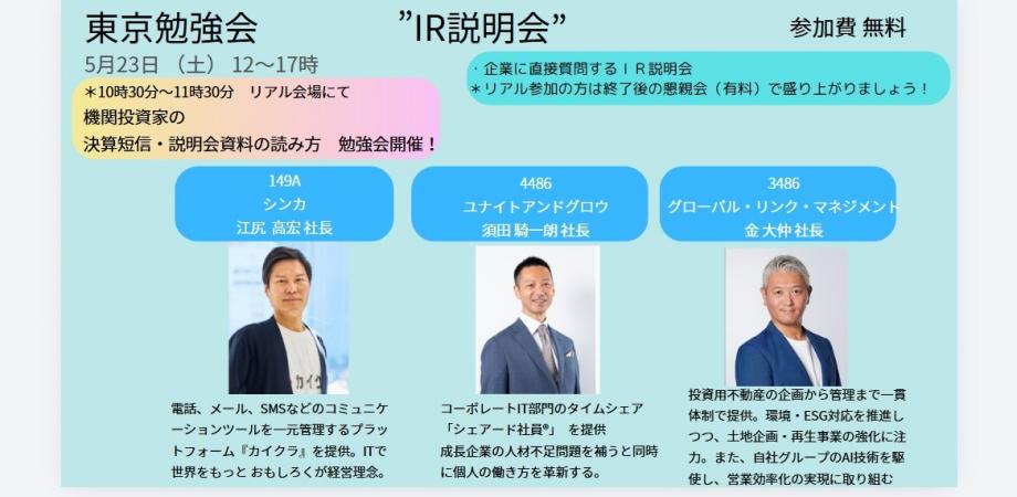 *詳細なご案内は直前にメールでご連絡いたします。・開催場所や配信URL:開催日の3~4日前に開催場所や配信URLなどをメール連絡・プレゼン資料:開催日の前日くらいまでに、当日使用予定のプレゼン資料をダウンロード配布(資料が届く時期はまちまち)この勉強会は個人投資家アイル、株式会社リンクスリサーチ、メルマガ億の近道の3者共同主催で開催しています。質疑の時間をたっぷりとって、徹底的に理解することを目指します。会場+オンラインでの開催