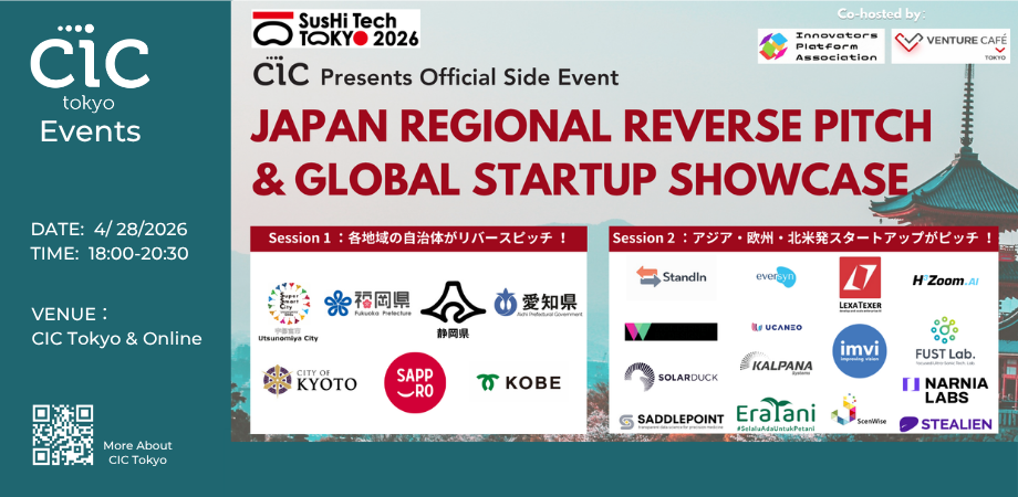 本イベントは英語で実施され、日英通訳サービスをご利用いただけます。The event will be conducted in English, and English–Japanese interpretation services will be available during the event.本イベントは、SusHi Tech Tokyo 2026公式パートナーイベントとして開催される国際共創イベントです。日本各地域の自治体を代表する皆様とSusHiTech 期間に来日中のスペシャルな海外スタートアップおよそ20社が登壇し、地域ニーズと世界の最先端技術を接続します。 ■ 開催概要日時:2026年4月28日(火)18:00–20:00会場:CIC Tokyo(東京都港区虎ノ門1-17-1 虎ノ門ヒルズビジネスタワー15F)形式:ハイブリッド開催(現地+オンライン)参加費:無料