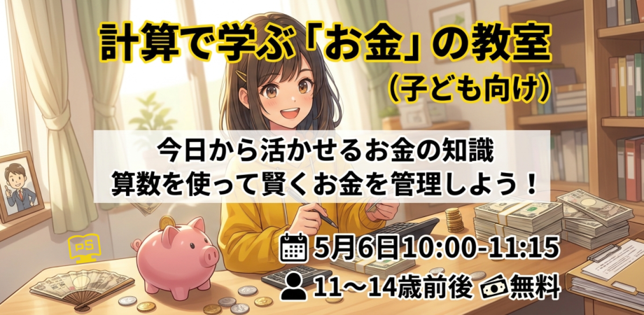 イベント詳細 ▍イベント概要お金について、算数を活かして考える力を身につけます。「無駄遣いを減らす」「お金を増やす」などについて、計算やシミュレーターを通して体感できます。金融リテラシーを身につけたいお子さまや、算数の活用場面を知りたいお子さまにお勧めです!