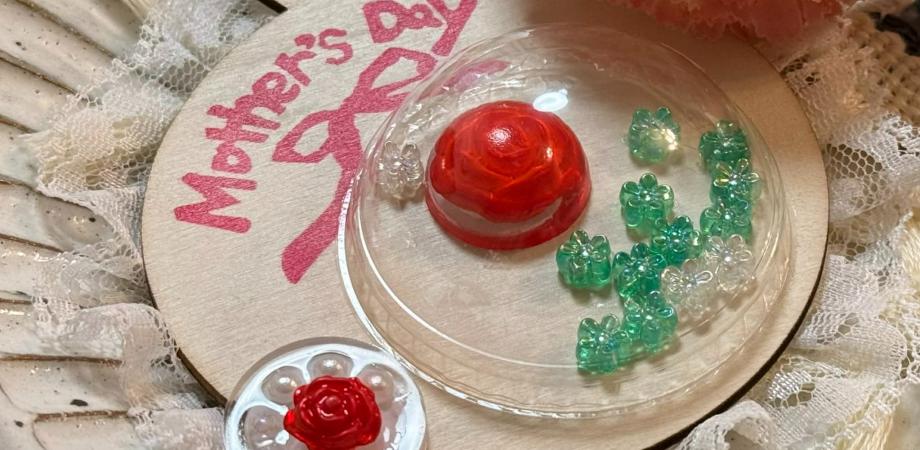 木製のオーナメントに消しゴムはんこで作成したMother's Dayとリボン🎀を押して、カップにビーズと色とりどりのお花をとじこめて作ります🌼