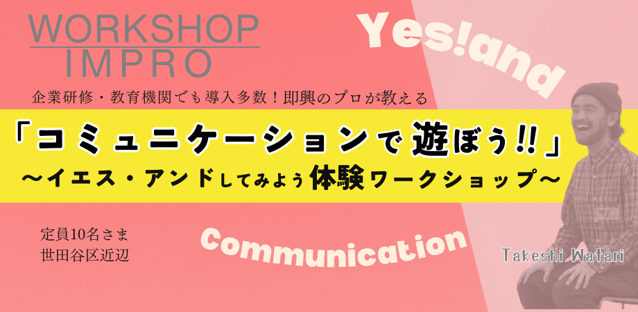 まずはうまくいかなくて良いゲームで目一杯遊びます。連想ゲームなどで、自由に自分の思ったことを言葉にしてみます。身体と脳がほぐれたあとに、インプロの思想であり技術である「イエス・アンド」を体験します。イエスアンドは、起きたことを否定せず受け取り、そこから展開していく考え方です。舞台の上だけでなく、日常の会話でも、人生の選択でも使えるスキルです。