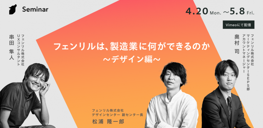 しかし、「製造業の業務システムに、デザインは本当に必要なのか?」 この問いに対し、多くの現場では「業務システムにデザインは不要」という誤解がいまだ根強く、使いにくいシステムが現場の生産性やモチベーションを阻害しているケースも少なくありません。本セミナーでは、フェンリルデザインセンターの副センター長を務める松浦が登壇。専任のUXコンサルタント、アカウントマネージャーと共に、「なぜ今、製造業にデザイン(設計)が必要なのか?」をテーマに、AI時代における人間の役割について議論を展開します。