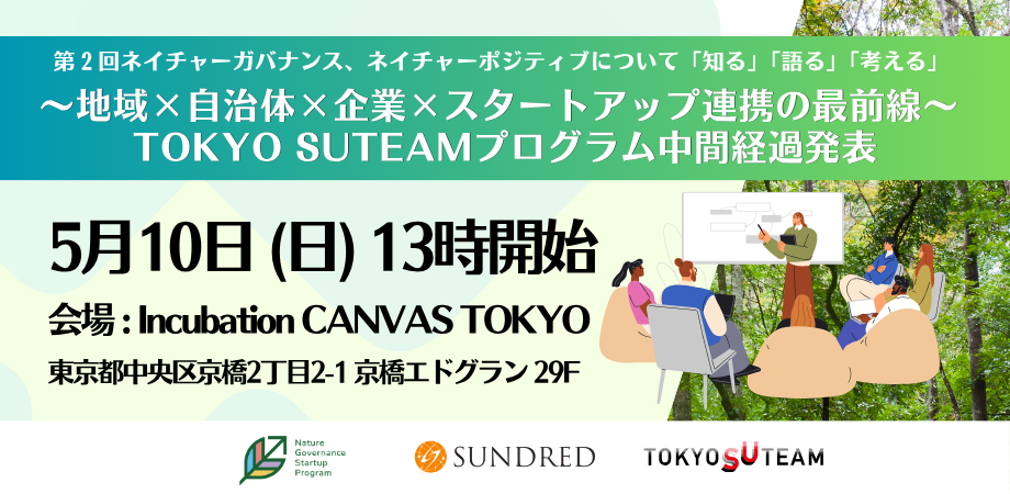 イベント詳細 第2回ネイチャーガバナンス、ネイチャーポジティブについて「知る」「語る」「考える」 〜地域×自治体×企業×スタートアップ連携の最前線〜 TOKYO SUTEAMプログラム中間経過発表