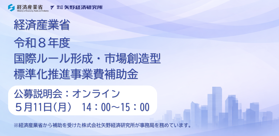イベント詳細 株式会社矢野経済研究所は、経済産業省より「令和8年度 国際ルール形成・市場創造型標準化推進事業費補助金」の事務局として採択され、補助事業の運営を行なっています。