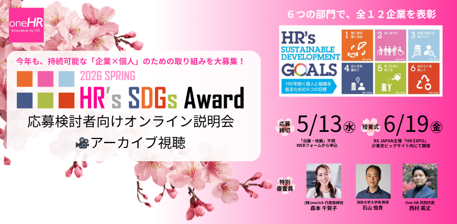 ・参加費:無料・対象: -企業の経営者・人事担当者 -おすすめの人事制度や取り組みをご存じの方(人事コンサルタントやエージェントの方) -知り合いの企業やエージェント、人材サービサーにアワード応募を勧めたい方・ナビゲーターOne HR共同代表 島崎由真【「HR's SDGsアワード」詳細・エントリーはこちらから】・募集対象:人的資本の開示内容全般ではなく、自社の社員の持続的な成長や働きがい向上のためのユニークな施策・制度をエントリー対象とします・6つの表彰対象:「個人×組織」創出のための共通目標「HR’s SDGs」に掲げる6つの目標を各賞として表彰を行ないます。①「働く責任 働く自由」賞②「違いを力に」賞③「本音で語れる場づくり」賞④「志と志を重ねて」賞⑤「育つために育てる」賞⑥「はたらくを楽しく」賞※ 6つの受賞企業の中から特別審査員によりグランプリ・準グランプリを決定。 また、会場参加者・視聴者の投票によるオーディエンス賞も決定します。・募集方法(自薦・他薦を問いません)※必須条件:受賞者ピッチ・授賞式(6/19(金)14:30~16:00、東京ビッグサイト)に参加できること