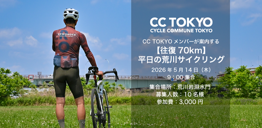 イベント詳細 楽しく安全に豊かなサイクルライフを。をテーマに会員制サイクルコミュニティ活動を続ける「CC TOKYO」が主催するサイクリングイベントです。今回のイベントは非会員の方も参加可能。初心者の方から経験者の方まで、サイクリング好きな方なら大歓迎。普段CC TOKYOメンバーが楽しむ「荒川サイクリングの定番ルート」ご案内いたします。荒川河川敷、何があるの?どういうルートが走りやすいの??そんな疑問も解決します。サイクリング好きな方々が繋がれる場としてもぜひ活用してください。そして今回は平日木曜日に開催!平日休みの方はぜひご参加ください!