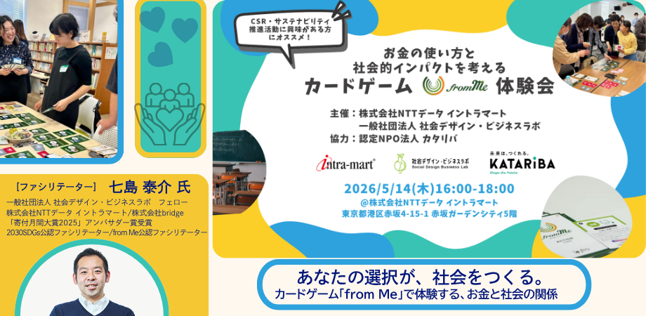 こんな方におすすめ・企業のCSR、サステナビリティ推進担当の方・楽しみながら社会貢献について考えてみたい方・社会をよりよくする行動・事業に関心のある方・学びを通して、共感できる仲間と出会いたい方・自分らしい“支援”や“貢献”のかたちを探している方・SDGs、ソーシャルアクション、ウェルビーイングに関心のある方