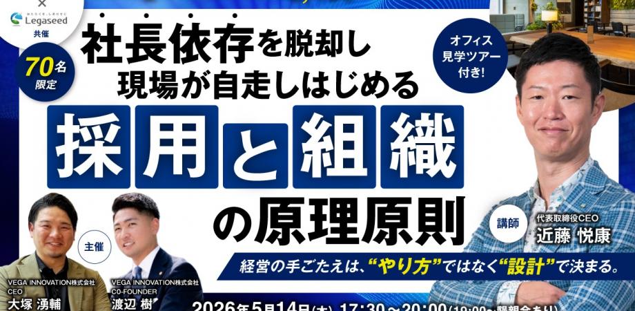 ★開催概要日程 2026年5月14日(木)17:30〜19:00 ※19:00~20:00で懇親会あり会場 株式会社Legaseedオフィス東京都港区港南2 -16 - 3 品川グランドセントラルタワー24F対象 経営者・経営幹部(70名限定)費用 無料定員 なし注意事項 ※フリーランス、競合他社(経営コンサルティング / 人材業界)の方はお申込みいただけません。