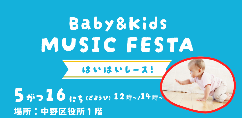 中野区役所で開催される「Baby & Kids MUSIC FESTA」の会場にて、ご家族みんなで楽しめる「はいはいレース」を開催いたします! 赤ちゃんの成長の記念に、ぜひお気軽にご参加くださいはいはいレースの他にも、子育て専門家によるセミナー、0歳から楽しめるワークショップ、さまざまな曲が楽しめるステージコンサート、専門家におやこの健康を相談できる「おやこ保健室(貧血チェック・骨密度チェック)」など、心も体もリフレッシュできる1日をお届けします🌟(※一部プログラム有料/要ご予約)イベント詳細はこちら→イベントHP\開催詳細/ 2026年5月16日(土) 12時〜/14時〜中野区役所1階ナカノバ 舞台前👶12時のレース:20名様👶14時のレース:20名様