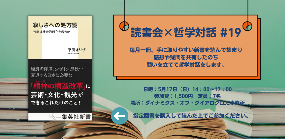 イベント詳細 毎月一冊、手に取りやすい新書などの本を読んで集まり、そこから生まれる問いをもとに哲学対話をする読書会です。