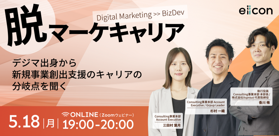 eiiconでは、デジタルマーケ経験を武器に、新規事業・オープンイノベーションの最前線で企業の変革そのものに向き合います。