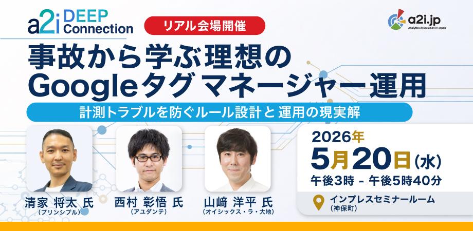 イベント詳細 デジタルマーケティングの深いテーマを、リアルな場で話し合う【 a2i DEEP Connection 】「事故から学ぶ理想のGoogle タグ マネージャー運用 ― 計測トラブルを防ぐルール設計と運用の現実解」誰も全体を管理していない、複数の支援会社がそれぞれのルールで触っている、気付かないまま計測トラブルが起きている。そんなGoogle タグ マネージャーの「あるある」な現場課題を出発点に、事故を防ぐためのルール設計と現実的な運用のあり方を議論するセミナーです。