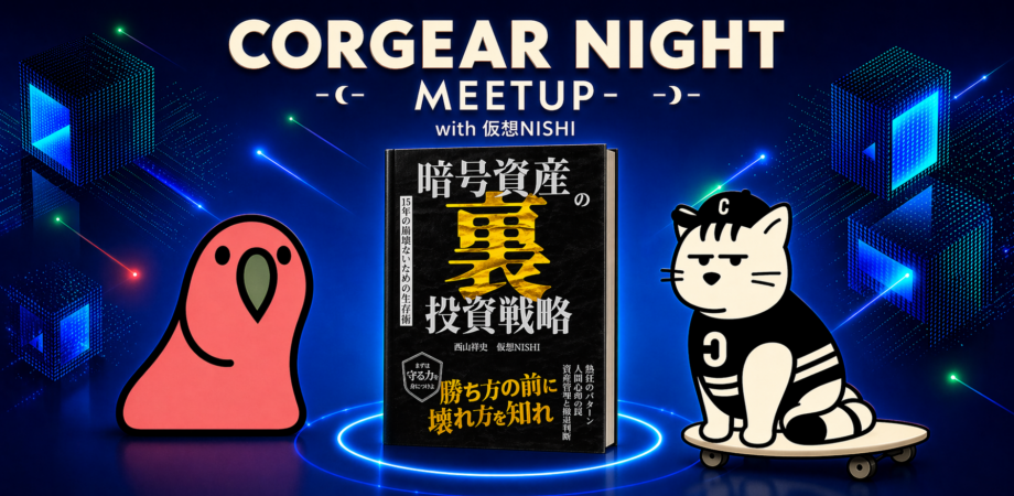 イベント詳細 CORGEAR Night vol.29 第29回 CORGEAR Night ~冬の時代をどう生き残るか ― 仮想NISHIと振り返るクリプト暴落の歴史~今回のCORGEAR Nightでは、暗号資産アナリストの仮想NISHI氏をお迎えし、これまでのクリプト市場における暴落の歴史を振り返ります。Mt.GOX崩壊、ICOバブルの終焉、長い冬の時代。 クリプトの歴史は、熱狂と暴落の繰り返しでもありました。 そのたびに市場の空気は一変し、多くのプロジェクトやプレイヤーが姿を消してきました。それでもなお、この領域に残り続け、変化を見続けてきた人たちがいます。仮想NISHI氏は、日々の相場分析に加え、この春には「中級者向けのトレーディング」と「仮想通貨の15年の歴史」をテーマにした書籍の発売も予定しています。 今回のイベントでは、そうした視点も交えながら、それぞれの暴落局面で何が起きていたのか、なぜ一部の人たちは生き残ることができたのかを振り返ります。
