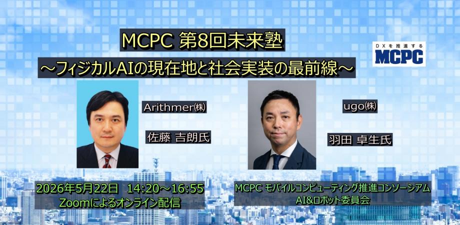 平素は MCPC AI&ロボット委員会、医療・ヘルスケアWG、量子コンピュータ・デジタルツイン推進WG活動について多大なご協力を賜り、厚く御礼申し上げます。 この度5月22日(金)に、「MCPC第8回未来塾セミナー『フィジカルAIの現在地と社会実装の最前線』」を実施する運びとなりました。本セミナーでは、近年注目が高まっているフィジカルAIについて、AIの知能をどのように現実世界の「行動」へと結びつけ、実際の現場や事業の中でどう活用しているのかという視点から、最前線の取組みをご紹介いただきます。ご多忙中のところ恐れ入りますが、多数のご参加をお待ちしております。また、これを機にMCPCへのご加入、当委員会への参加もご検討頂けたら幸甚です。