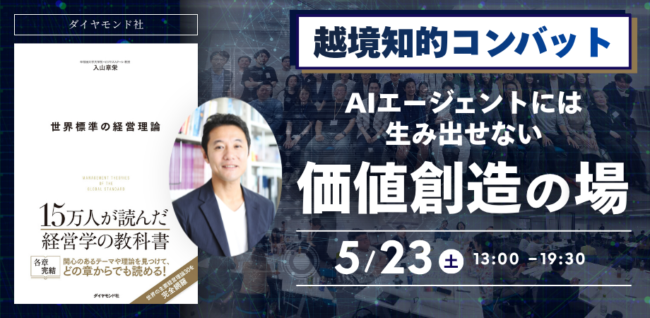 この度、2026年度第1回の越境知的コンバット全国大会をダイヤモンド社にて開催します。全国からビジネスパーソンらが集まり、特定のテーマでリアルの場で交わす熱い議論が行われます。リアルでこそ体感できる、AIエージェントに生み出せない価値が創造される場となります。さらに著者の入山教授が登壇します。著者とも交流できる貴重な機会です。