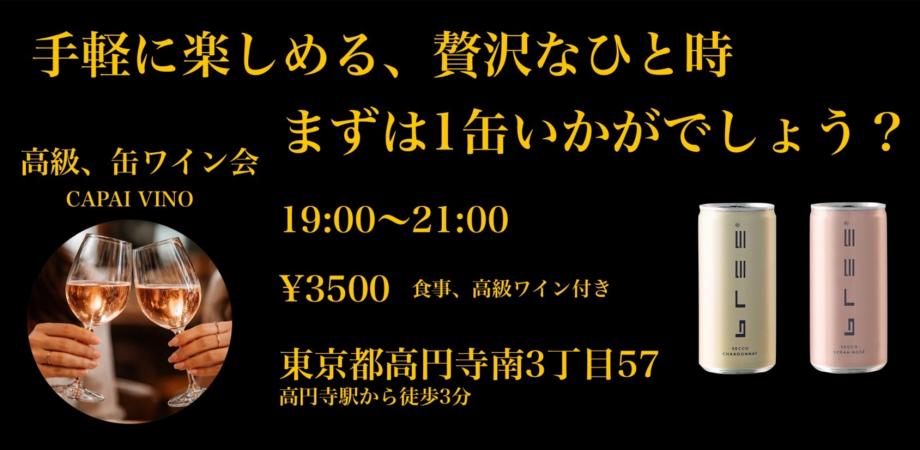 イベント詳細 【缶ワイン会について】「日本にワインをもっと身近に」をテーマにCANPAI VINOが開催する カジュアルな缶ワイン会 です。缶ワインの飲み比べと、月替わりのお料理を楽しみながら、気軽に集まり、話して、くつろげる時間をお届けします。ワインに詳しくなくても大丈夫。難しいルールや堅苦しさは一切ありません。缶ワインから始める、新しいワイン体験をぜひお楽しみください【食事について】和食、イタリアン、フレンチ、居酒屋料理長など現場経験を活かし和洋中を作っている出張調理人にお願いしているので料理もしっかり楽しめます。※当日はビュッフェ形式※持ち込み・差し入れもOKです【こんな人におすすめです】・ワインを飲んだことはないけど、飲んでみたい・ワインが好き・仕事終わりや休日に、楽しい時間を過ごしたい・友人や人脈を増やしたい・美味しいご飯を楽しみたいこんな思いにこたえるイベントです!もちろん「目的は特になし、ただ参加したい」人も大歓迎です!【時間】19:00から21:00途中参加、途中退室OK!【会場】ASOBIBA東京都杉並区高円寺南3丁目57(新宿駅から2駅、高円寺駅から徒歩3分)(新高円寺駅から徒歩9分)※場所の詳細は突然の来訪を避ける為、参加申し込みされた方のみ共有しておりますが、当日までに共有漏れがある場合は主催までご連絡ください。不明な点がある場合は運営担当の大川までお電話ください。担当番号 08090559887【会場のASOBIBAについて】完全予約制のイベントスペースで交流スペースとしてはもちろんポーカー、ボードゲーム、パーティーゲーム、麻雀、90インチの大型スクリーンでの動画視聴なども楽しめるようになっています。 【参加料金】3500円(税込)・缶ワイン飲み比べ・お料理込み【注意事項】当日、InstagramおよびHPブログ用の撮影が入る場合があります。ご了承のうえ、チケットのご購入をお願いいたします。【禁止事項とご利用規約】参加者の皆様に楽しく安全にお過ごしいただくため下記の禁止事項を設けてます。参加者の皆様は、参加者間、参加者と当会スタッフ間において、パワハラやセクハラ、暴言、大声、差別的な発言、悪口、嫌がらせ、いじめ、過度な勧誘や営業、執拗に連絡先を聞く事、進行の妨害をすることはできません。参加者から複数のクレームが起きた場合は理由の如何を...