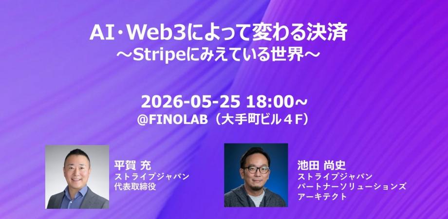 イベント詳細 生成AIの進化やステーブルコインの実装は決済に大きな変化をもたらそうとしています。今回のセミナーにおいては、世界を代表するフィンテック企業であるストライプがこうした変化をどのようにみているか、そしてどのようなソリューションを提供しようとしているのか聞く機会を設けましたので、是非ご参加ください。◆日時 :2026年5月25日(月) 18:00-20:30(開場 17:45)◆会場 :FINOLABイベントスペース 東京都千代田区大手町1-6-1 大手町ビル4F ※大手町ビルは東西に長いビルで入口は東端、東京駅側にあります。 ◆参加費用:無料 ◆主催 :Stripe Japan/FINOLAB◆アジェンダ: 18:00-18:15 日本の決済をめぐる変化 (柴田 FINOLAB) 18:15-18:30 Stripeの紹介、発展の歴史と現状(平賀 Stripe) 18:30-19:15 StripeによるWeb3.0の取り組み エージェンティックコマースとステーブルコイン(池田 Stripe) 19:15-19:30 Q&A 19:30-20:30 ネットワーキング◆登壇者(順不同、敬称略)