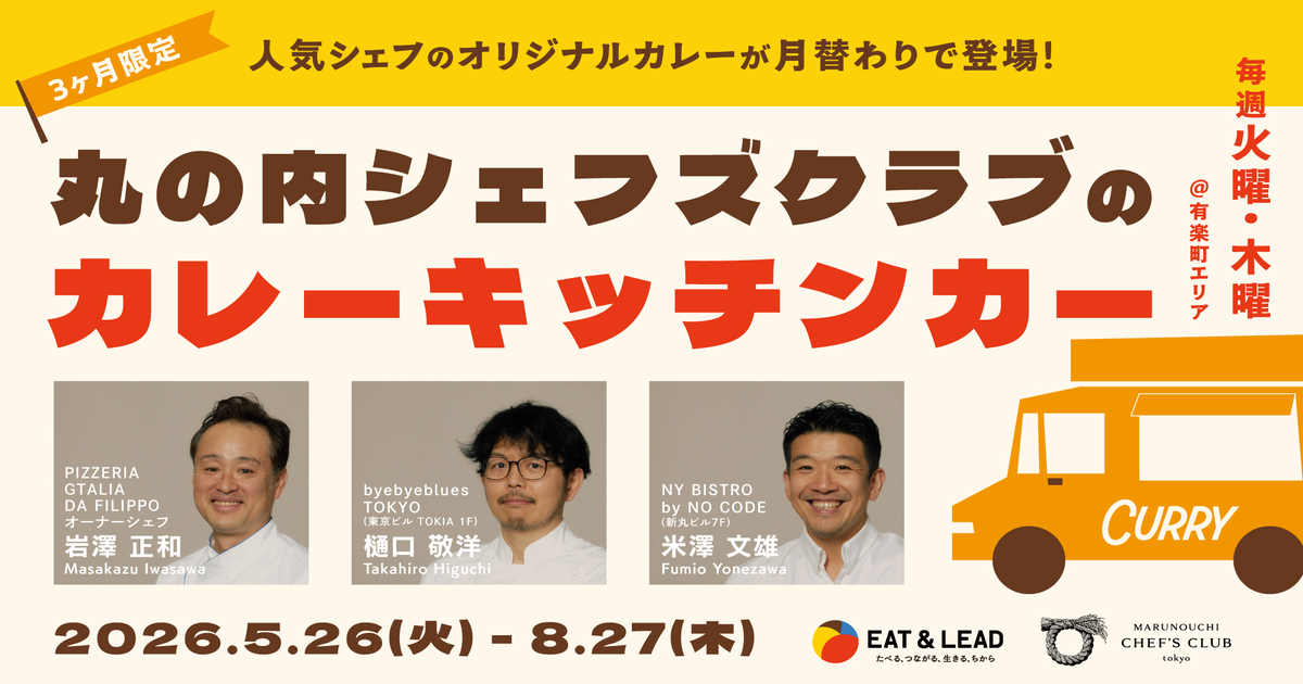 丸の内で「食」を切り口に、より良い社会の実現を目指し多様な活動を続けてきた丸の内シェフズクラブが、ランチという日常的なシーンを起点に新たな取り組みを始めます。3人のシェフ考案によるオリジナルメニューを提供するキッチンカーと、食にまつわる思いや背景を届けるラジオ番組が連動し、食の可能性を多角的に発信します。街で働く一人ひとりに、これからの「食べること」を考えるヒントを届けます。