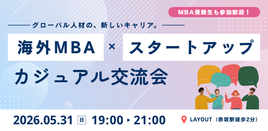 【イベント詳細】📅 日時:2026年5月31日(日)19:00〜21:00(18:45受付開始)📍 会場:LAYOUT(東京都港区赤坂2-14-8 赤坂SKビル3F/千代田線赤坂駅 徒歩2分)💰 参加費:7,500円(飲み放題付き・半立食スタイル)👥 対象:海外MBA受験生・合格者・在校生・卒業生(※Public policyやData scienceなどMBA以外の大学院留学の方もご参加頂けます!)