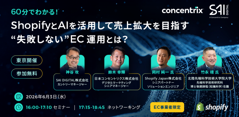 ◆16:00-16:10ご挨拶 SAI Digital株式会社 カントリーマネージャー 神谷 攻 ◆16:10-16:30 2026年感覚ではなく、構造で小売を語る ~現場の経験を、学術の言葉で読み解く。Eコマース&小売最前線~北陸先端科学技術大学院大学 先端科学技術研究科博士後期課程(知識科学)在籍 竹永 靖 氏「売上拡大に必要なこと」それはいかにリピートしてもらえるか。商品の魅力、顧客満足度、ECプラットフォーム活用だけではないリピーター対策の具体的な例についてお話しします。さらに昨今の国際情勢の変化による物価高騰や異常気象の増加など、外的要因をいかに回避し、影響を最小限に抑えるポイントや、それらを踏まえた2026年からの消費者動向についてもお伝えします。 ◆16:30-16-50 人員・コスト不足から売り上げ拡大を目指すEC運用における5つのポイント!日本コンセントリクス株式会社デジタルマーケティングシニアマネージャー 鈴木 幸輝無限にある施策の中から何をどう選んで実施すれば成果として現れるのかについて、自身が...
