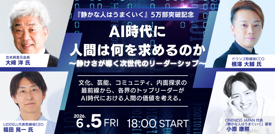 吉本興業の元会長としてエンタメ業界を牽引してきた大崎洋氏。ドワンゴ取締役CCOとしてデジタルメディアの最前線に立つ横澤大輔氏。 日本最大級のインフルエンサーマーケティング企業LIDDELL代表の福田晃一氏。そして、『静かな人はうまくいく』著者のONENESS JAPAN代表 小原康照。