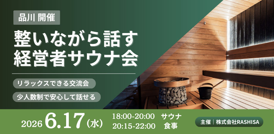 商談でもなく、交流会でもなく、 「整いながら話す」経営者の時間をつくりました。サウナというリラックスした環境だからこそ、 普段のビジネスの場では出てこない・経営の本音 ・価値観 ・人生観といった話が自然と出てくることがあります。本会では、サウナで一度リラックスしてから少人数でゆっくり食事をしながら会話をすることで、「この人と長く付き合いたいか」という、人としての信頼関係を感じられる時間をつくれたらと思っています。RASHISAでは 「いい人」とだけ繋がれる環境づくりを大切にしています。私たちが考える「いい人」とは、・人の挑戦や努力を応援できる人 ・目的や目標を持っている人 ・リスペクトを持って関われる人一方で、・横柄な態度を取る方 ・他者をリスペクトできない方 ・短期的な利益のみを追う方こうした価値観の合わない関係が増えてしまうと、 コミュニティは本来の価値を失ってしまいます。そのため本会では、 安心して交流できる環境づくりを大切にしています。サウナで整いながら、 自然体で話せる経営者の時間を過ごせたら嬉しいです。■この会の特徴① サウナだからこそ生まれる本音の会話リラックスした環境の中で、 普段の交流会では出てこない本音や価値観に触れることができます。② 少人数で深く話せる最大8名の少人数制のため、 一人ひとりとしっかり会話できる場を設計しています。③ 長く付き合える経営者と出会えるその場の営業ではなく、 中長期で信頼できる関係づくりを目的としています。■日時6月17日(水)サウナ:18:00〜19:30食事:20:00〜21:30■場所サウナスナック「かなこ」〒140-0004 東京都品川区南品川3丁目1−8■参加費サウナ代:実費(約3,000円前後)飲食: 実費(5,000〜7,000円想定)■主催・株式会社YMS ・株式会社RASHISA■参加人数8名(主催含む)■参加対象以下に当てはまる方・法人の取締役以上の役職者■当日の流れ・サウナ(自由に交流しながら) ・食事(少人数でゆっくり会話)※少人数だからこそ、深く話せる時間を大切にします■参加方法① 本ページより参加申込② 主催者よりご連絡③ Messengerグループへご招待④ 当日会場にてお支払い※なお、RASHISAまたは主催企業と面識がない方は、参加前にオンライン面談...