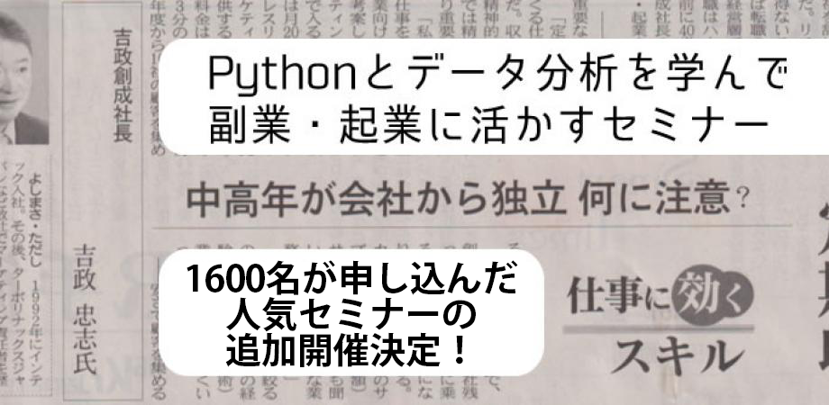 ここ最近は試験以外のお問い合わせで、キャリアについてのご質問やセミナー希望のお話をいただくことが増えてきました。(基本的にキャリアについての質問をPythonエンジニア育成推進協会にされても回答しません)そこで今回「 Pythonとデータ分析を学んで副業・起業に活かすセミナー」を開催することにしました。セミナー概要を以下に記載しますので、興味がある方は是非ご参加ください。