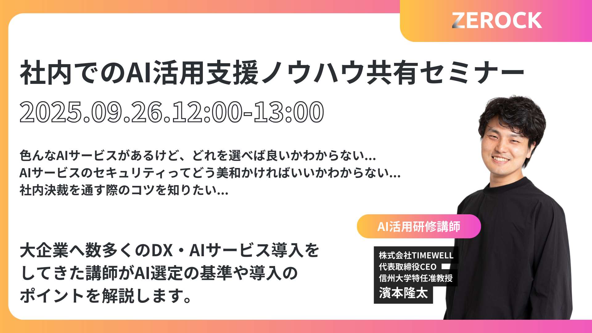 本セミナーでは、大企業へのAI・DX導入支援を多数行ってきたTIMEWELL代表・濱本隆太氏が登壇し、