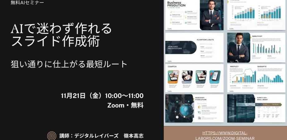 イベント概要とセミナーの内容 資料作成を手作業で行うと、時間がかかるうえに「センスが足りない」仕上がりになりがちです。一方で、AIに任せても“AIっぽさ”が... powered by Peatix : More than a ticket.