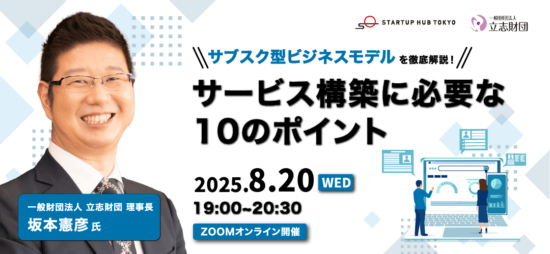 サブスク型ビジネスモデルを作るために必要な10のポイントとは? 本イベントでは、『サブスク型ビジネスモデル』についてのセミナーです。継続的な成功を実現するためのサブスクリプション型ビジネスを作るヒントをお話いただきます。 サブスク型ビジネスモデルを学び、自身のビジネスのヒントを得る場にしていただければと考えます。 今回、銀行出身で1万人以上の起業家・経営者を指導してきた起業家育成のスペシャリスト「坂本 憲彦」氏をお迎えして、 初心者向けに融資を引き出すポイントや成功事例についてもお話いただく予定ですので是非ご参加ください! カリキュラム ①なぜ、今、サブスク型ビジネスモデルを作らないといけないのか? ②サブスク型ビジネスモデルの6つのパターンを学ぶ ③私たちの成功事例 ④サブスクモデルの失敗事例 ⑤サブスク型ビジネスモデルを作るために必要な10のポイント ※内容は予告なく変更する場合があります。予めご了承ください。 タイムスケジュール 19:00~19:05 イベントスタート: 施設紹介 19:05~19:10 登壇者 自己紹介 19:10~20:00 セミナー 20:00~20:20 質疑応答(事前のご質問承ります!リアルタイムでも質問可能です) 20:20~20:30 終了