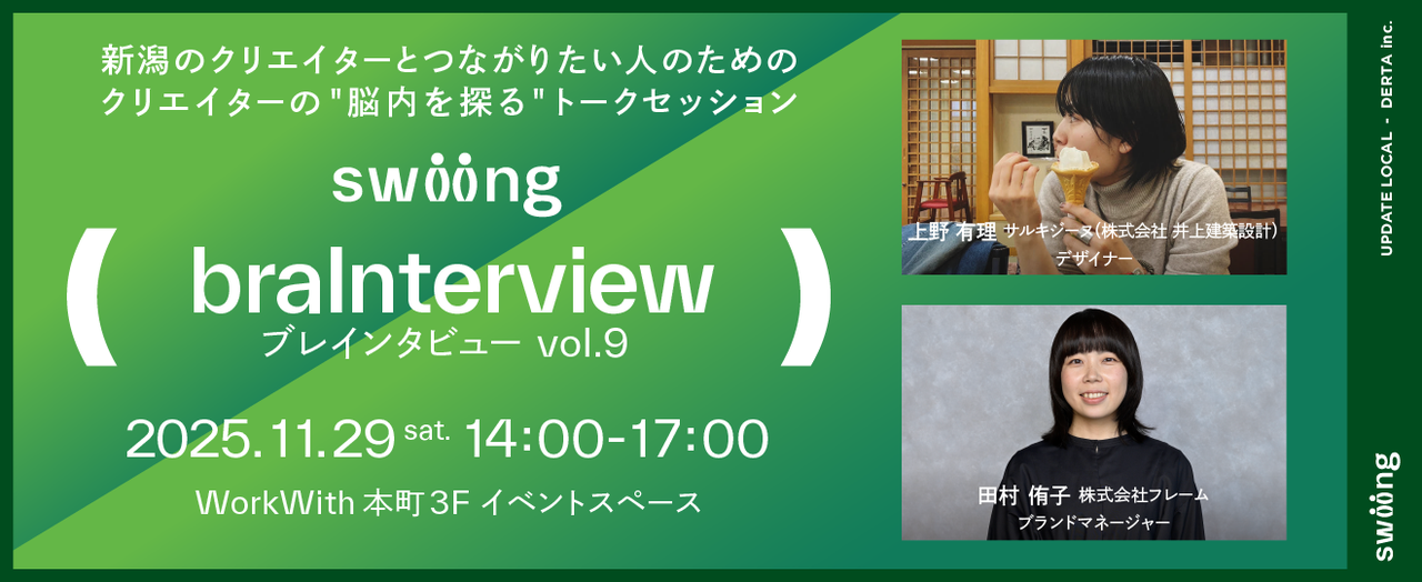 ## 🎉大好評につき満席となりました!!🎉 おかげさまで、追加募集枠も含めて満席となりました🎊 ありがとうございます!! 学生枠のみ特別に2枠ご用意しましたので、学生さんはお申し込み可能です👨🎓👩🎓 一般の方向けにキャンセル待ち枠をご用意いたしましたので、キャンセルが出た場合は先着順にご案内させていただきます🙏 何卒ご了承ください🙇 ## Swiingイベント|braInterview(ブレインタビュー)とは? 新潟県のクリエイターを集めたプラットフォーム「Swiing」では、新潟県に拠点を持つクリエイター同士の交流・コラボレーションを創出し、クリエイターとの協...