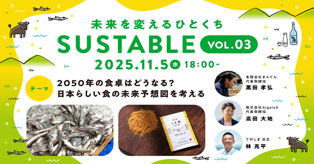 サステナブルフードについて“おいしく・楽しく”学べる『SUSTABLE2025VOL.3』開催のお知らせSUSTABLE(サステーブル)とは、私たちの日々の食卓や食生活を、これからも持続可能にするために配慮してつくられている食べ物である「サステナブルフード」について“おいしく・楽しく”知っていただくためのプログラムです。食の「作り手」である生産者、「使い手」であるシェフ、そして「食べ手」である消費