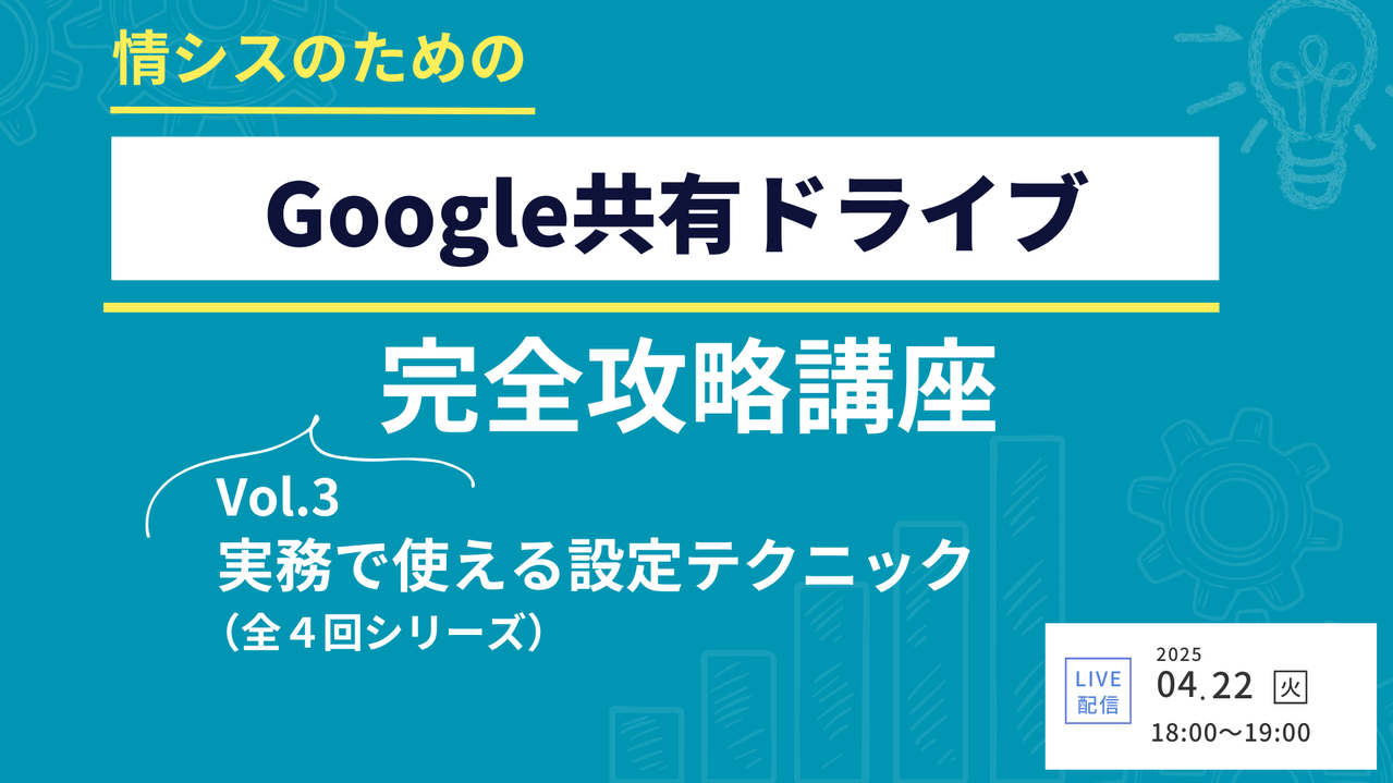 # 概要 本ウェビナーは、Google Workspaceを導入したものの「上手くルール設計できていない」「セキュリティ面が不安」とお悩みの情報システム部門の皆様に向けた実践的な講座(全4回シリーズ)の第3回目です。 前回のアンケート結果から、多くの企業が「共有ドライブの運用ルールが未整備」「部門ごとのアクセス権限設定の難しさ」「ユーザーの使い方のバラつき」といった課題を抱えていることがわかりました。今回はこれらの課題を解決するための具体的なテクニックを紹介します。 当日は、Google Workspaceのセキュリティに精通したエキスパートが、カオスな状態を整理する方法や権限設計...
