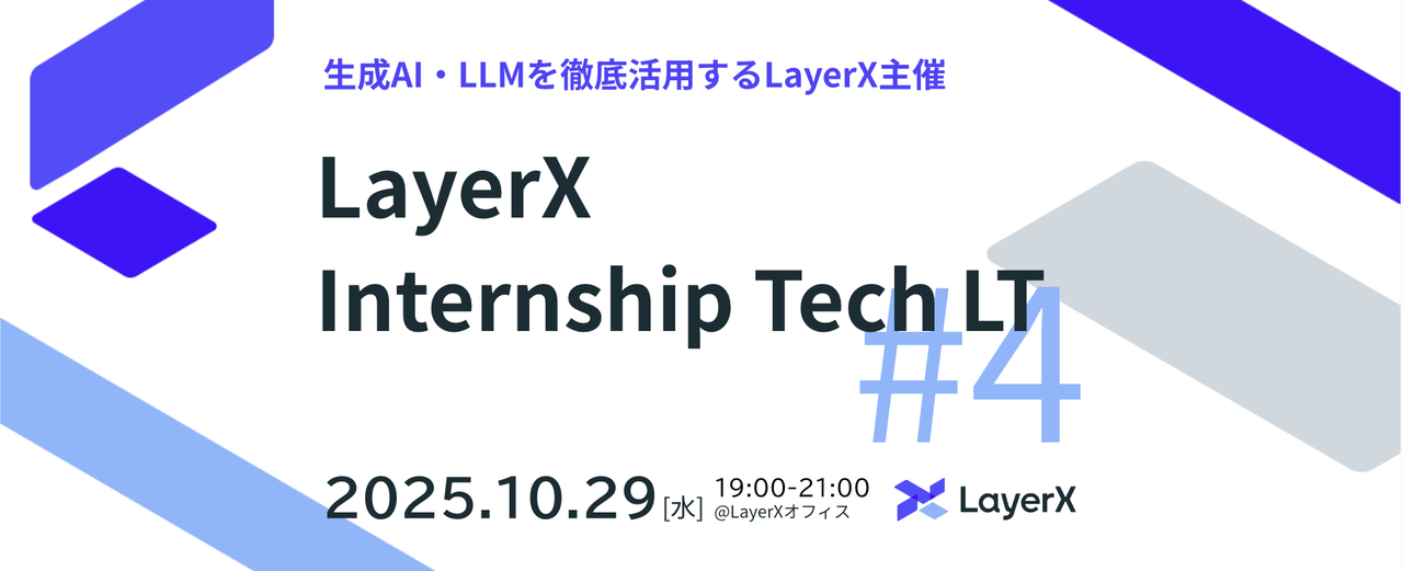 # LayerX Internship Tech LT #4 ### 🚀 LayerX エンジニアインターンによる実務インターンLT大会 🚀 LayerX「バクラク事業部」と「AI・LLM事業部」にて、実務インターンを経験したエンジニアインターンたちが登壇! 実務インターンで得た経験や学びを共有する場として、技術的な気づきや挑戦のリアルな声をお届けします。 「実務インターン」と言っても、ミッションや取り組む内容は会社ごとに様々かと思います。 このLT会に参加していただくと、「LayerXの実務インターンでは具体的にどんなことに取り組むのか」「どんな学びを得られるのか」の解像度を上...