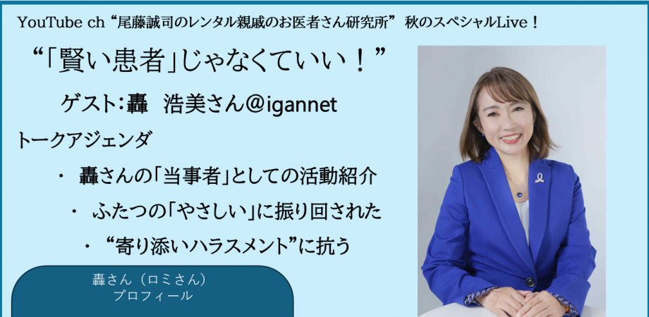 YTチャンネル「尾藤誠司のレンタル親戚のお医者さん研究所」は、医療を受けるにあたっての心配なことや不安なこと、専門家とのコミュニケーションで何となくもやもやしたりむかついたりしたこ... powered by Peatix : More than a ticket.