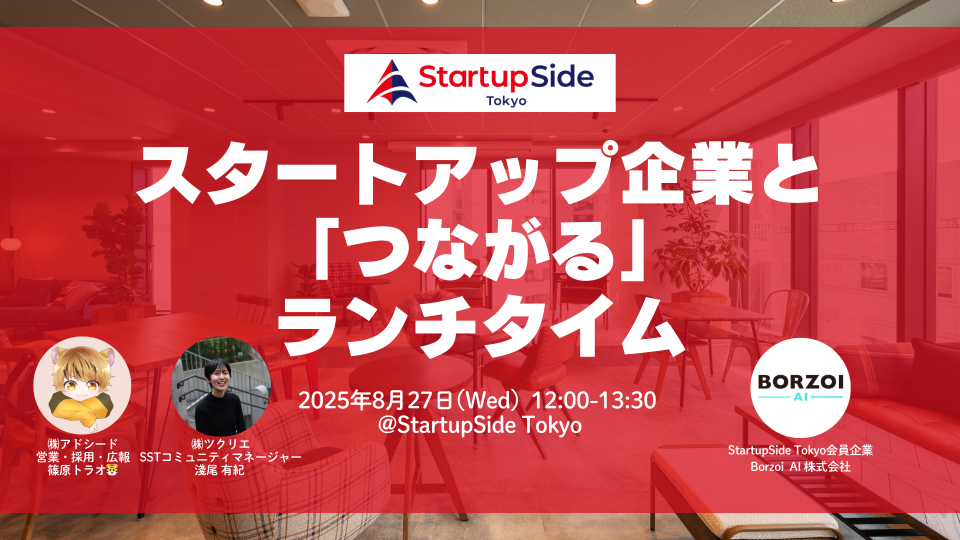 このイベントは、スタートアップ企業で働く方々とのカジュアルな交流を通じて、 新たなビジネスの可能性やキャリアのヒントを見つけることを目的としています。 ランチを囲みながら本音で語り合うことで、 普段の業務では得られない刺激や人とのつながりを生み出す場を提供します。 将来的な協業や転職など、予期せぬチャンスが生まれることも期待しています。 初の開催となる今回は、 最先端の言語モデルや画像認識技術を活用し、ごみ分別支援アプリ「AIごみナビ」など、日常生活に役立つアプリケーションを開発しておられる、StartupSide Tokyo会員の「Borzoi AI株式会社」にご参加いただき、自社の取り組みやスタートアップでの働き方などについてお話いただきます!