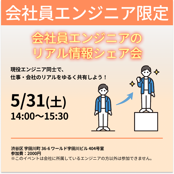 ## 会社員エンジニアのリアル情報シェア会【渋谷】 2025年5月31日(渋谷) ## このイベントについて この交流会は、会社に在籍しているエンジニア同士が、自社のリアルな情報を共有することで、今後のキャリアや転職活動に役立ててもらうことを目的にしています。 「思っていた会社と違った…」 「人間関係や制度にギャップがあった…」 そんな“転職のミスマッチ”を防ぐために、実際に在籍しているエンジニアの生の声を交換することもできます! こんな方におすすめ ・将来的に転職を考えている方 ・他の会社の実情を知りたい方 ・エンジニア同士でフラットに話したい方 ・キャリアに悩んでいてヒント...