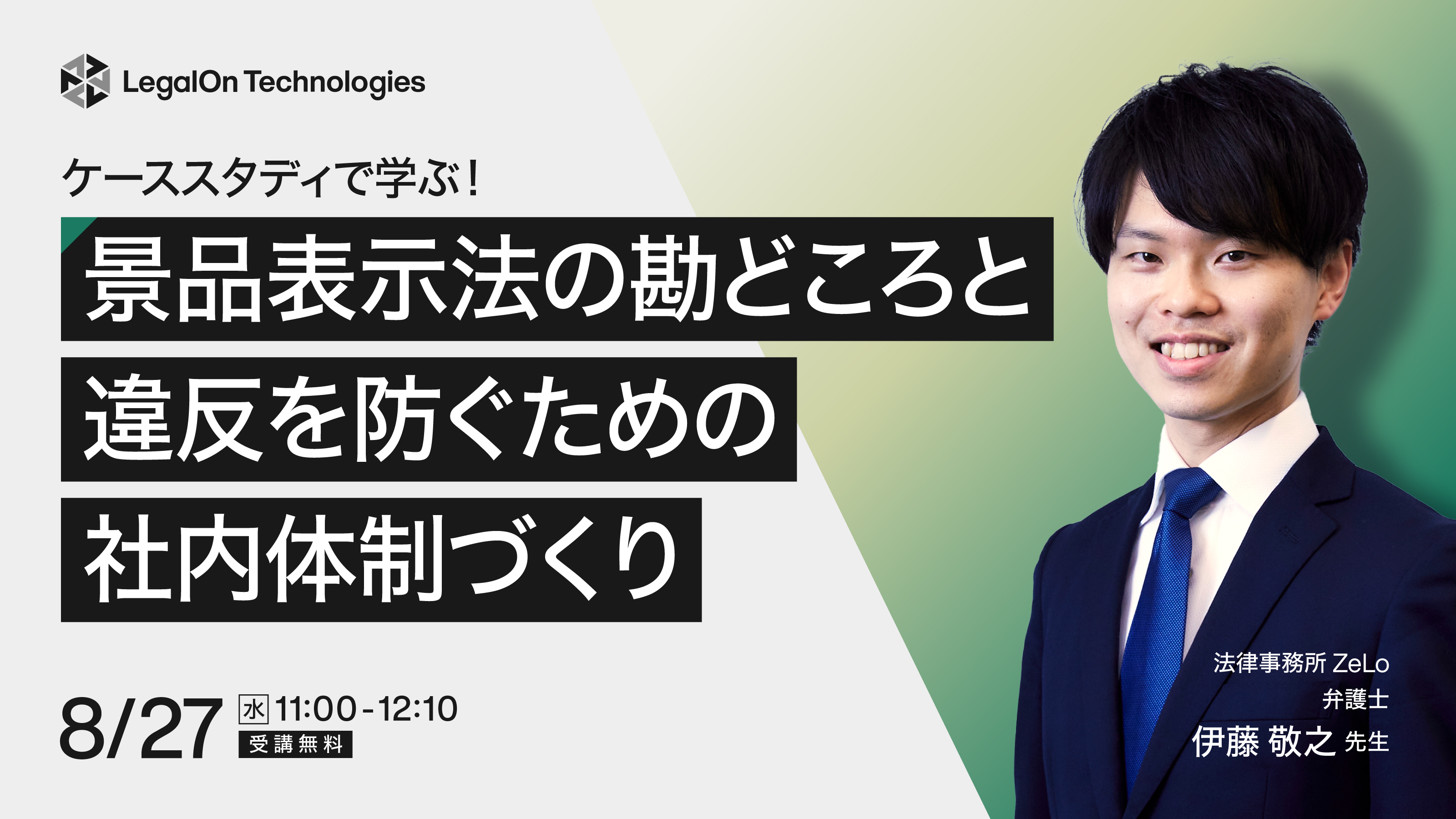 「不当景品類及び不当表示防止法(景品表示法)」では、消費者が自主的かつ合理的に商品・サービスを選択し、消費者の利益を保護するための規制が定められています。広告施策は商品・サービスなどの告知に効果的な施策である一方で、「広告・表示」に関するトラブルや行政処分が後を絶ちません。特にここ数年は、消費者庁による調査・指導が強化されており、措置命令や課徴金の適用事例も相次いでいます。企業にとっては、法令違反による信用の失墜や高額な課徴金負担といった重大なリスクにつながる問題です。 事業部だけでは判断が難しいケースも多く、法務部門においては、マーケティングや商品企画等の現場と連携しながら、的確なリスク評価とルール整備を進めることが不可欠です。しかし、「どこまでチェックすべきか」「過去の事例に照らしてどう判断すべきか」に悩む法務担当の方も多いのではないでしょうか。 本セミナーでは、景品表示法の基本的な枠組みや直近の運用動向を押さえたうえで、実際の違反事例をもとにケーススタディを行い、実務上の留意点や勘どころを解説します。また、違反を未然に防ぐ実効性のある社内体制づくりのコツもお話しします。 講師を務めるのは、消費者庁表示対策課にて多数の広告表現の違反調査の実績を持つ、法律事務所ZeLoの弁護士 伊藤敬之先生です。