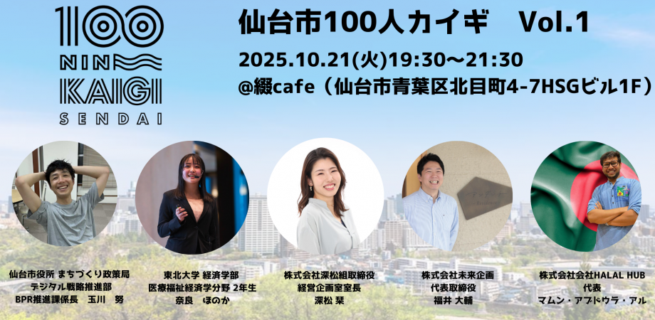 🌿 仙台市100人カイギ vol.1 開催決定! 仙台市で活躍するゲストを毎回5名ずつお招きしてトークイベントを実施します🙌 「ゲストが100人になったら会を解散する」というルール... powered by Peatix : More than a ticket.